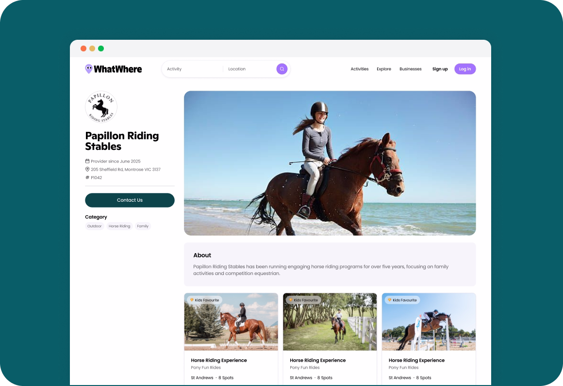 We get it, not every business has the time or budget for a website. With WhatWhere, your business gets a dedicated page where families can easily discover your activities, view timetables, and book directly with you online. Quick to set up, easy to update.